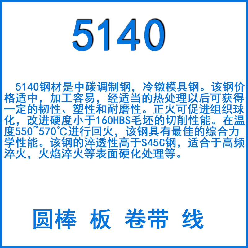 5140鋼材是中碳調(diào)制鋼,冷鐓模具鋼。該鋼價格適中,加工容易,經(jīng)適當?shù)臒崽幚硪院罂色@得一定的韌性、塑性和耐磨性。正火可促進組織球化,改進硬度小于160HBS毛坯的切削性能。在溫度550~570℃進行回火,該鋼具有最佳的綜合力學性能。該鋼的淬透性高于S45C鋼,適合于高頻淬火,火焰淬火等表面硬化處理等。